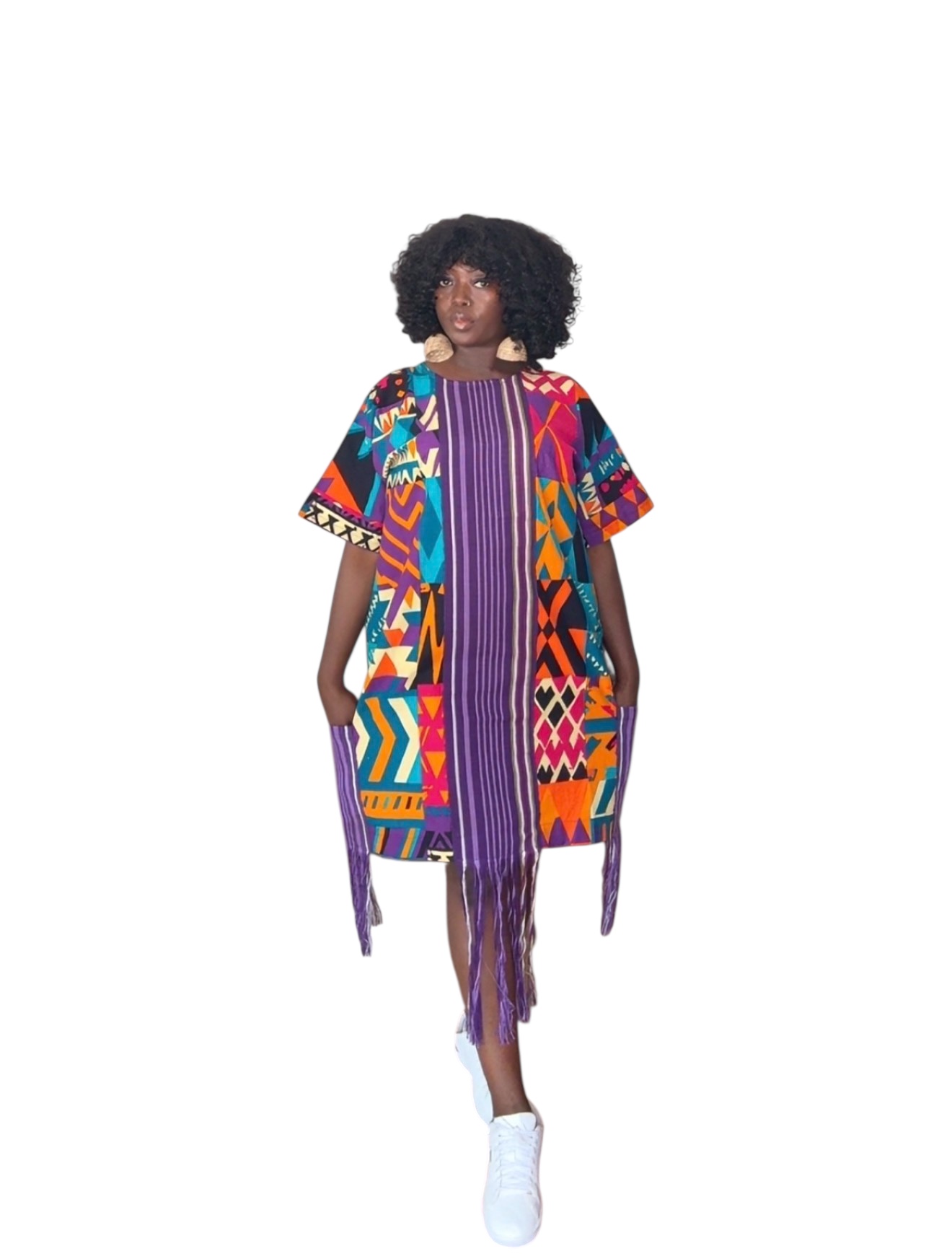 Designed with two functional pockets at each lower side, it blends practicality with elegance. The rich patchwork print and textured Aso Oke detailing add depth, character, and a unique handcrafted finish you’ll truly appreciate.