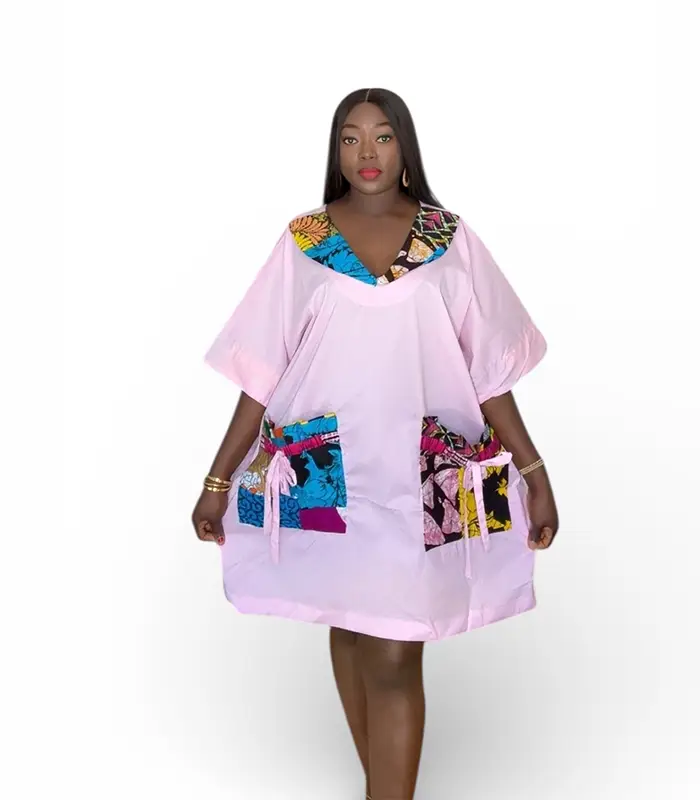 If you love effortless outfits that still look put-together, MUNA is for you. This knee-length dress is not fitted—it’s designed with a loose, relaxed silhouette for all-day comfort, finished with bold African-print details at the neckline and pockets. Perfect for everyday wear, brunch dates, holidays, and cultural outings.